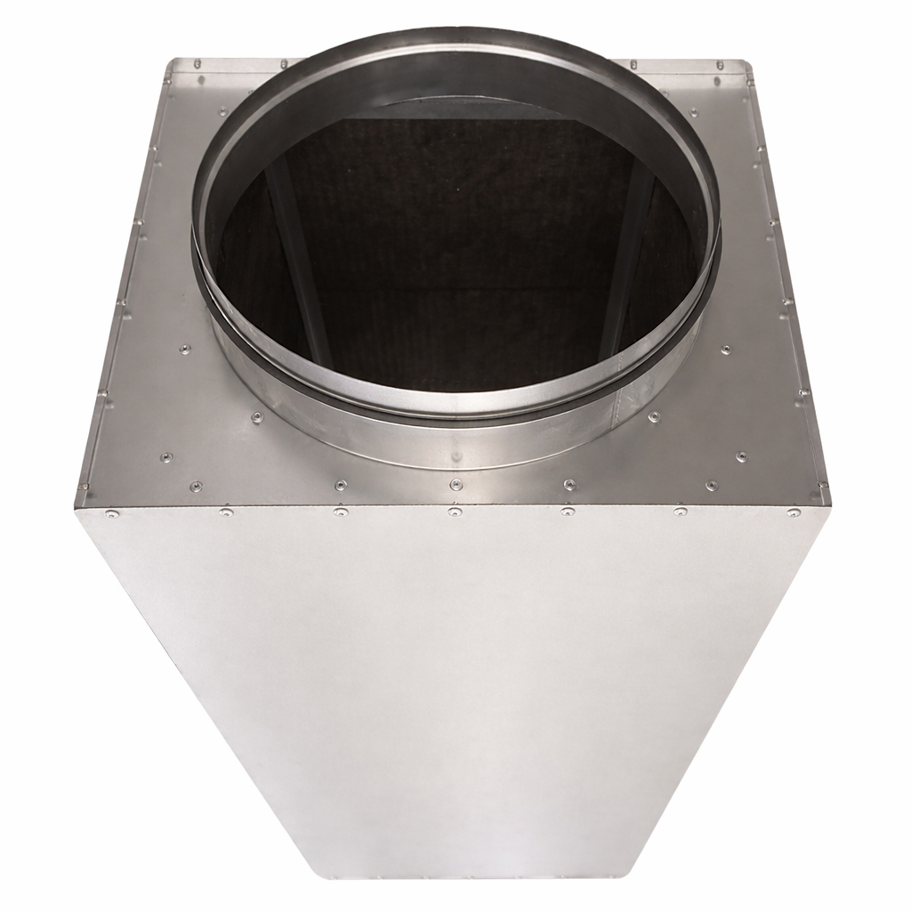 Корпус шумоглушителя изготовлен из оцинкованной стали, внутри расположен звукопоглощающий слой из минераловатного материала с защитным покрытием. Номинальная длина шумоглушителя 900 мм обеспечивает заметное снижение уровня шума на участке между вентустановкой и помещениями при сохранении расчётного расхода воздуха по трассе.