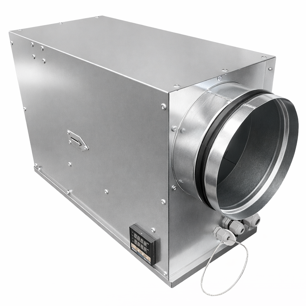 Корпус нагревателя изготавливается из оцинкованной стали и рассчитан на встраивание в круглые воздуховоды, что упрощает монтаж и обслуживание. Используются керамические PTC-нагреватели с саморегулирующимся нагревом для безопасной и устойчивой работы. Мощность около 0,9 кВт достаточна для подогрева приточного воздуха для данного сечения канала. Питание нагревателя от однофазной сети 220 В, что делает подключение удобным для большинства объектов. Встроенный регулятор управляет работой нагревателя по сигналу от датчика температуры в воздуховоде, поддерживая заданную уставку и предотвращая перегрев.