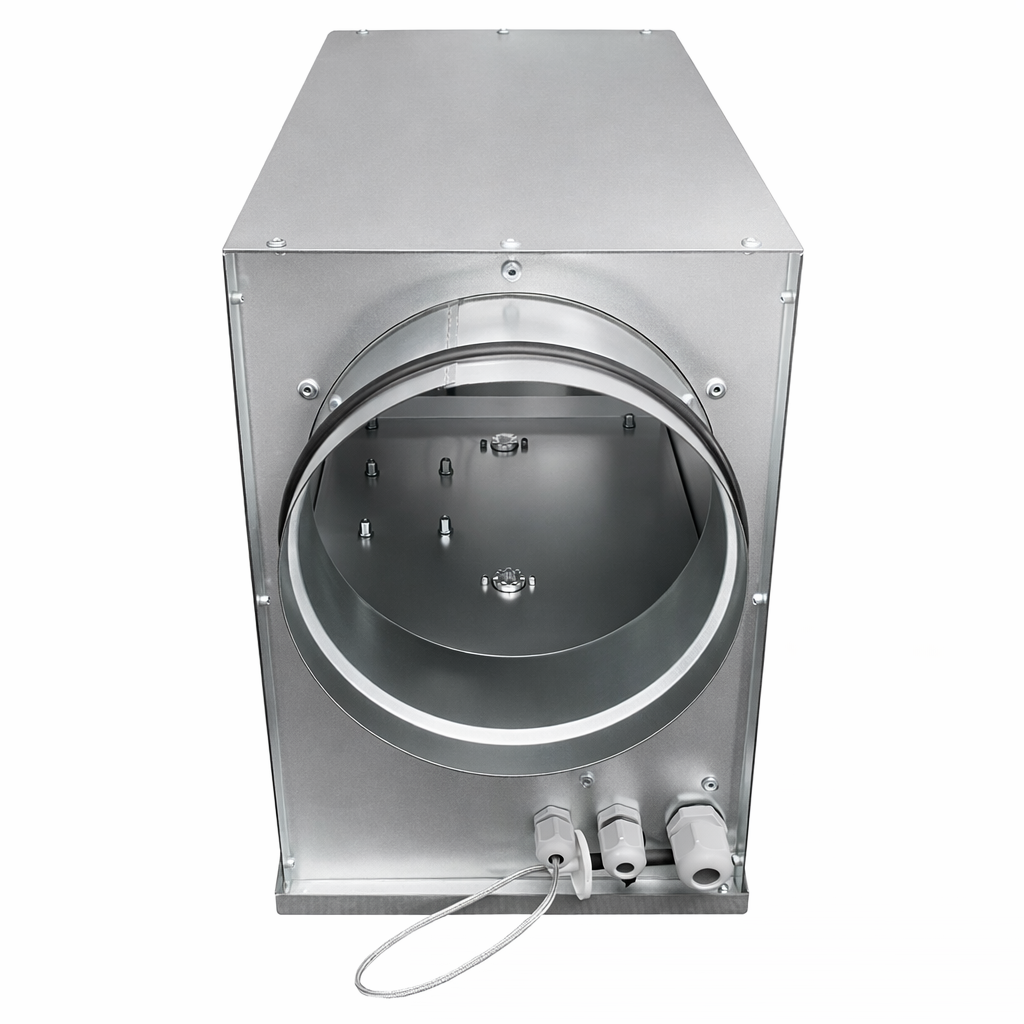 Корпус нагревателя изготавливается из оцинкованной стали и рассчитан на встраивание в круглые воздуховоды, что упрощает монтаж и обслуживание. Используются керамические PTC-нагреватели с саморегулирующимся нагревом для безопасной и устойчивой работы. Мощность около 2,5 кВт достаточна для подогрева приточного воздуха для данного сечения канала. Питание нагревателя от однофазной сети 220 В, что делает подключение удобным для большинства объектов. Встроенный регулятор управляет работой нагревателя по сигналу от датчика температуры в воздуховоде, поддерживая заданную уставку и предотвращая перегрев.
