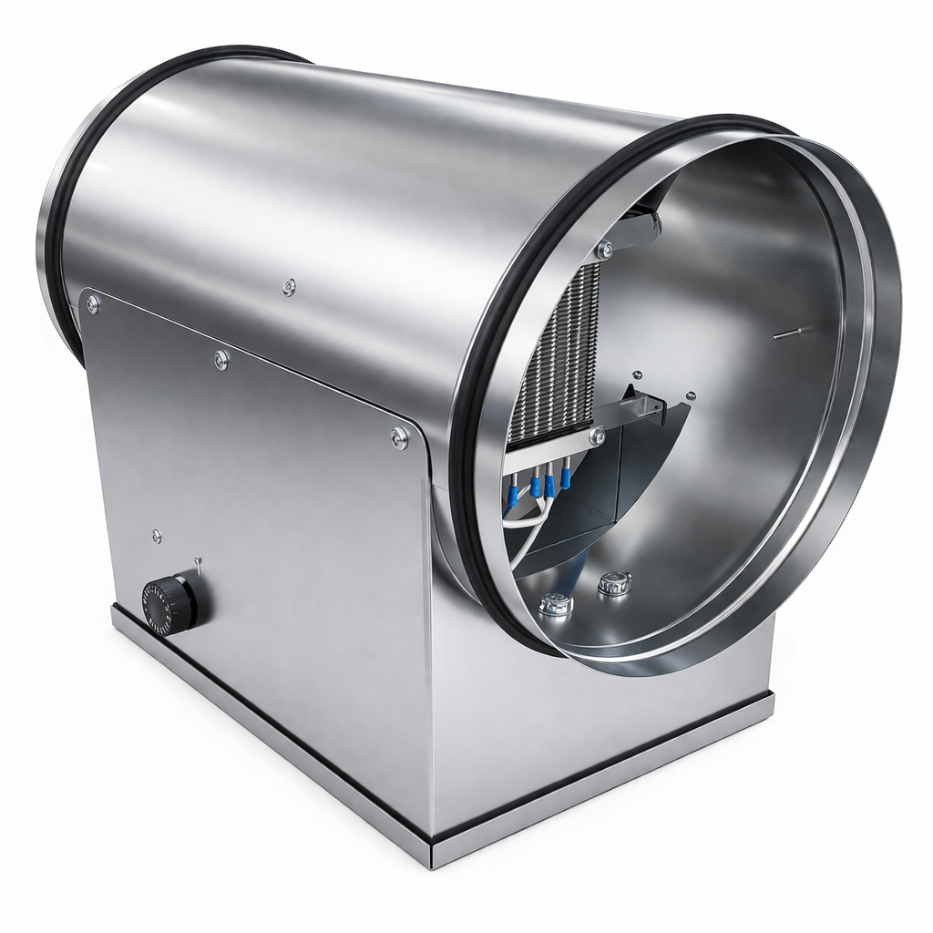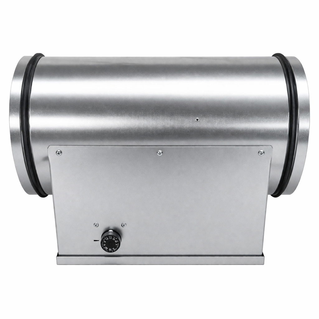 Корпус нагревателя изготавливается из оцинкованной стали и рассчитан на встраивание в круглые воздуховоды, что упрощает монтаж и обслуживание. Используются керамические PTC-нагреватели с саморегулирующимся нагревом для безопасной и устойчивой работы. Мощность около 3 кВт достаточна для подогрева приточного воздуха для данного сечения канала. Питание нагревателя от однофазной сети 220 В, что делает подключение удобным для большинства объектов. Встроенный регулятор управляет работой нагревателя по сигналу от датчика температуры в воздуховоде, поддерживая заданную уставку и предотвращая перегрев.