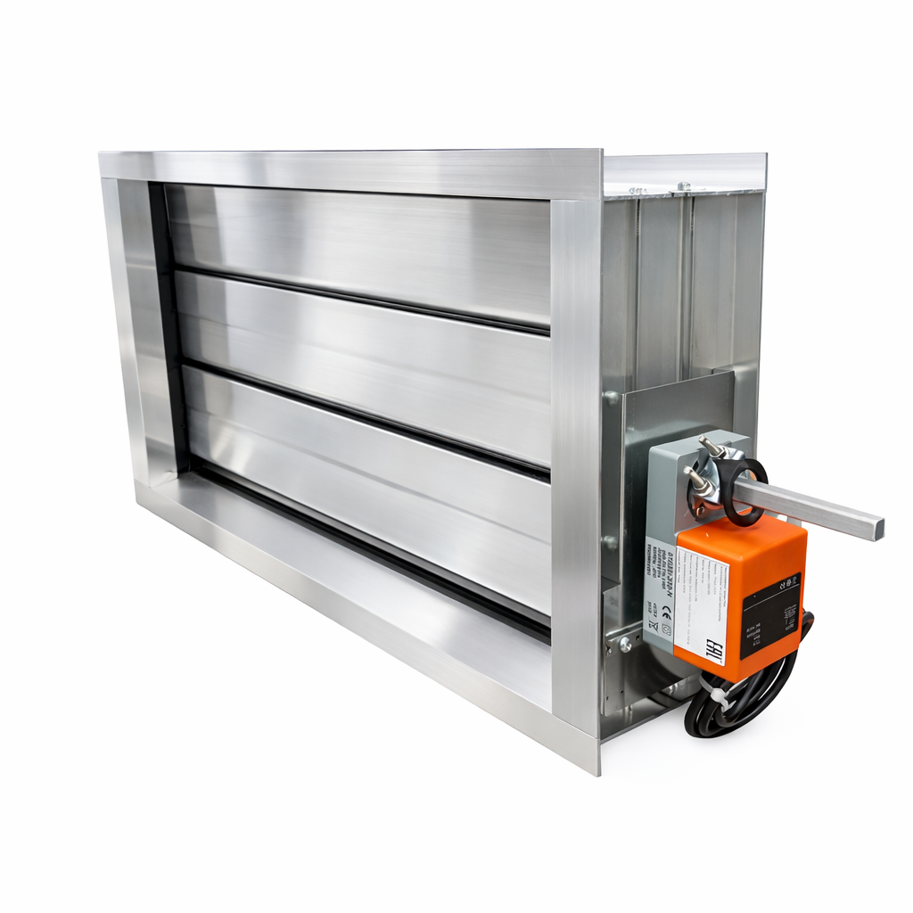 Прямоугольная форма корпуса удобна для подключения к воздуховодам соответствующего сечения и помогает сохранить компактную компоновку сети. Клапан оснащён электроприводом без пружинного возврата, что удобно для стандартных режимов работы в составе системы автоматизации вентиляции. Плавное изменение положения заслонки позволяет точно настраивать объём приточного и вытяжного воздуха между помещениями.