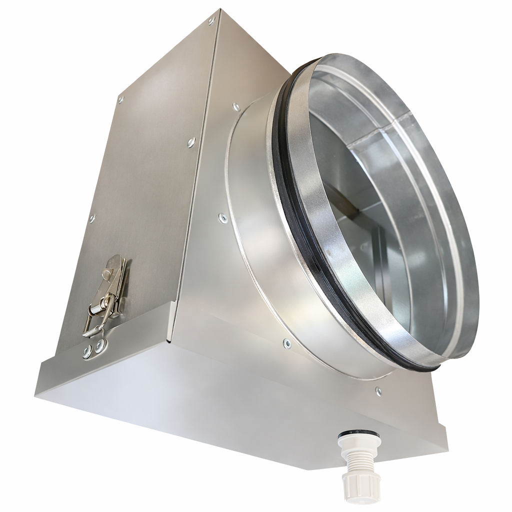 Корпус жироуловителя с присоединительным диаметром используют для размещения сетчатых жироулавливающих кассет в составе вытяжной вентиляции профессиональных кухонь ресторанов, кафе и столовых. Корпус встраивают в участки круглых воздуховодов и вытяжные зонты, чтобы собрать жировой туман до попадания в основную сеть воздуховодов.
