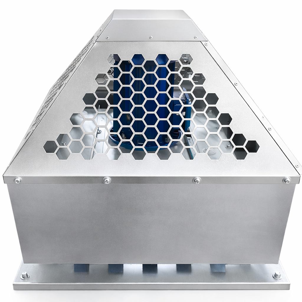 Корпус адаптирован к эксплуатации на открытом воздухе и защищает рабочее колесо и двигатель от осадков и ветровых нагрузок, поэтому вентилятор можно безопасно устанавливать на кровлях административных и производственных зданий. Оборудование обеспечивает напор до 1210 Па, работает от двигателя мощностью примерно 0.55 кВт, этого достаточно для вытяжных сетей с несколькими ответвлениями и решётками.