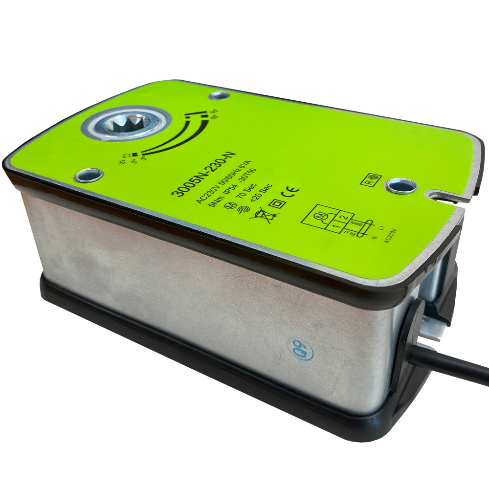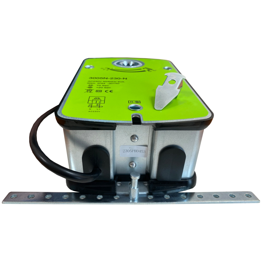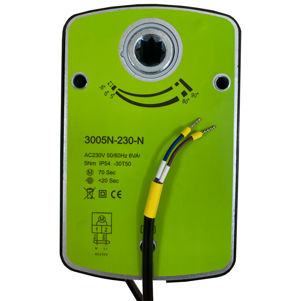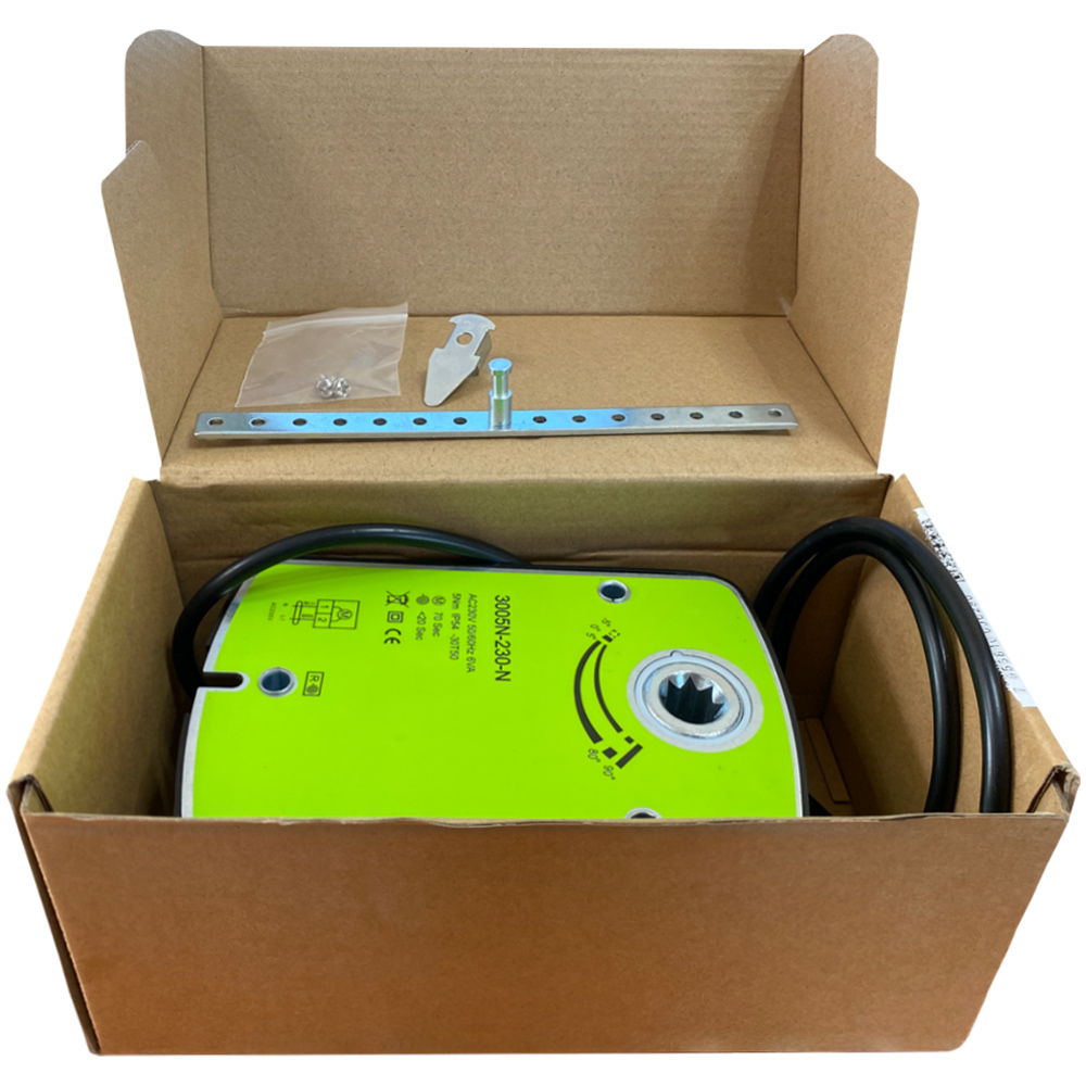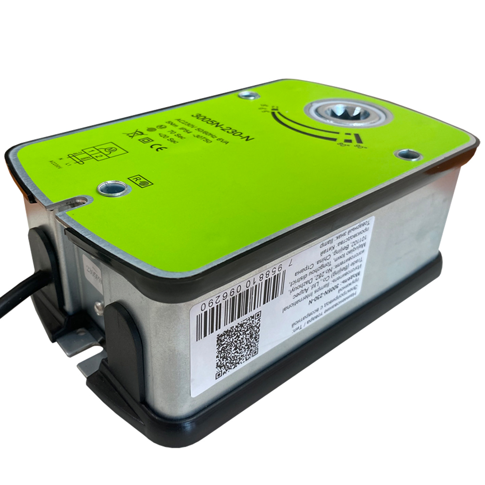 Привод воздушной заслонки с пружинным возвратом 5Hm, 230В с усилием около 5 Н·м предназначен для автоматического поворота и фиксации створок круглых и прямоугольных воздушных заслонок в системах вентиляции. Он используется в составе приточных, вытяжных и приточно-вытяжных установок, помогая управлять расходом воздуха и режимами работы системы без ручного вмешательства.