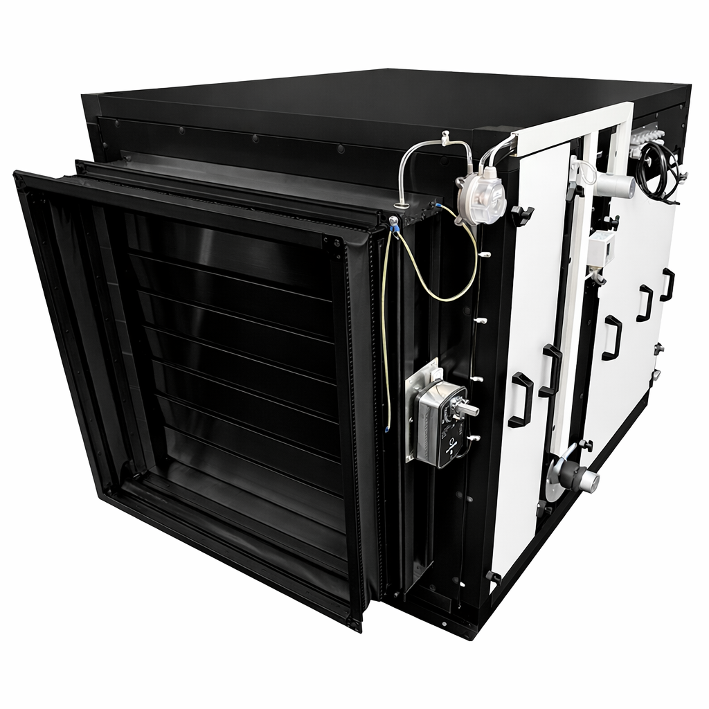 Установку обычно размещают в отдельном техническом помещении или венткамере, оставляя достаточно места для обвязки и удобного сервиса основных узлов. По своим возможностям модель ориентирована на серьезную нагрузку по воздухообмену и хорошо подходит для крупных офисных и коммерческих объектов.