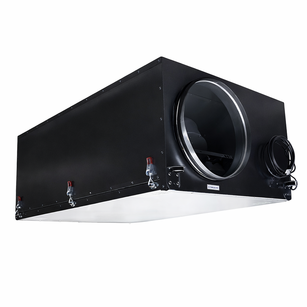 В составе установки используются энергоэффективный EC-вентилятор, фильтр класса G4, керамический электрический нагреватель приточного воздуха, поэтому узел работает как готовый приточный агрегат для объекта. По основным характеристикам мощность вентилятора около 0.49 кВт, максимальный напор до 1209 Па, уровень шума порядка 45 дБА, этого достаточно для типовых сетей воздуховодов с решетками и гибкими вставками. Питание от трехфазной сети 380 В ориентировано на стабильную работу при высокой нагрузке и хорошо сочетается с инженерной инфраструктурой современных бизнес центров и торговых комплексов.