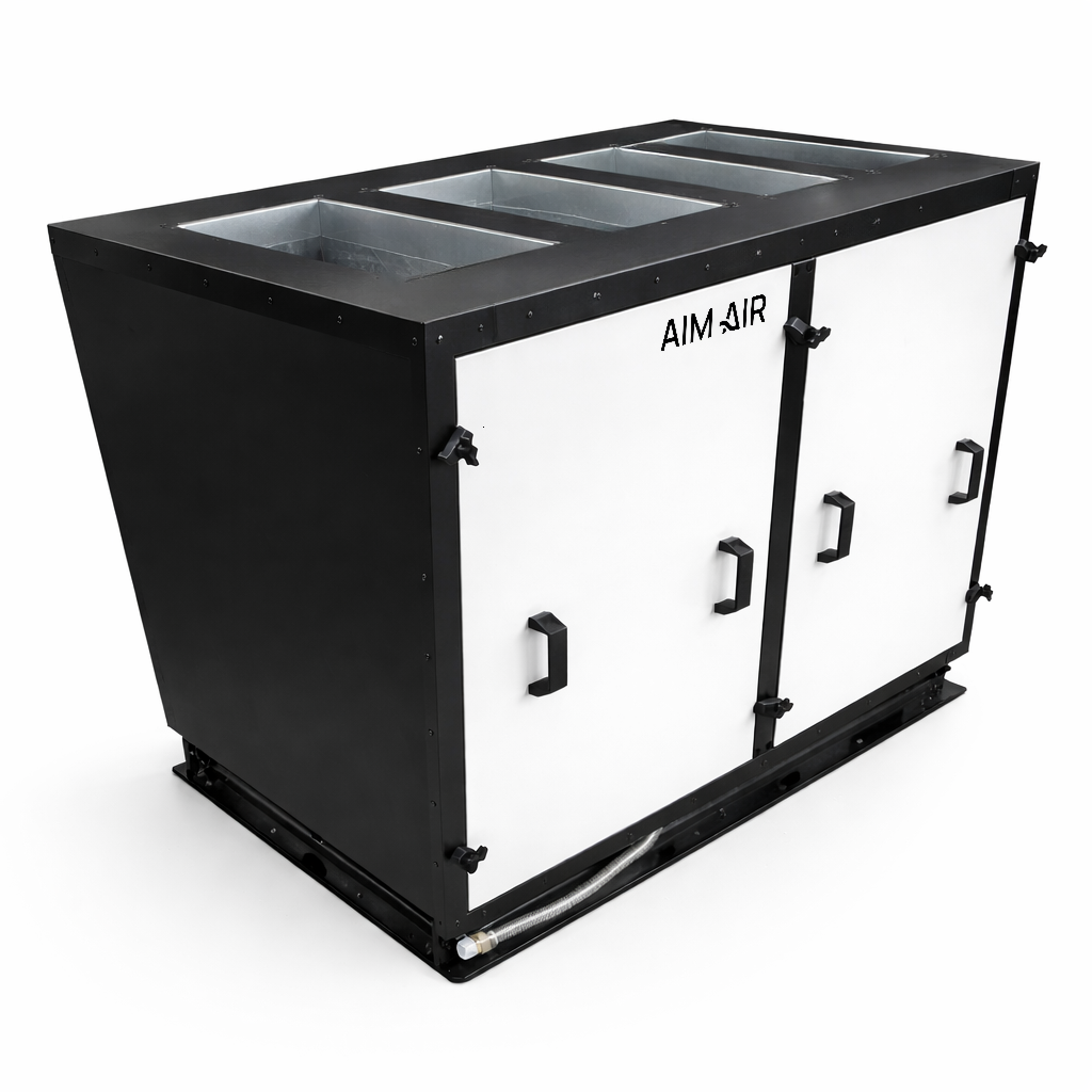Такую установку применяют на офисных этажах, в учебных аудиториях и коммерческих пространствах с постоянным потоком людей. Такой форм-фактор удобен для монтажных организаций, к установке легко подвести воздуховоды, а регламентное обслуживание не вызывает сложностей. Для службы эксплуатации важно, что доступ к фильтрам и теплообменникам организован с учётом регламента обслуживания, а работа установки остаётся предсказуемой по режимам и затратам.